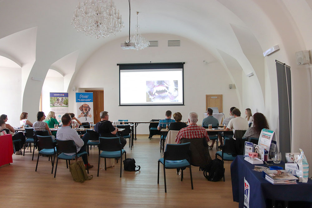 Nosným tématem letošního setkání byly zajímavé klinické případy. Přednášející se etablovali z řad našich i zahraničních uznávaných odborníků. Kolega Juraj Hanzel nás dopodrobna seznámil s historií a vývojem zubního kazu. Bohužel v jeho přednášce o historii nezazněla ani drobná zmínka o historické stopě velké české mystické osobnosti Járy Cimrmana. Kolegyně Jana Václavíková nás detailně obeznámila s problematikou dentigerozní cysty. Ve druhé části nám odprezentovala zajímavý případ osteomyelitidy pandy červené. MVDr. Zbyněk Lonský zakládající člen CVDS a předseda sdružení obohatil naše setkání s klinickými případy chirurgického prořezávání retinovaných zubů u psů. Kolegyně Radka Zemánková svojí prezentací objasnila možnosti chirurgických zákroků na spodní čelisti při mandibulektomiích. V následující přednášce nám ukázal možnosti řešení bilaterální fraktury mandibulárních premolárů. Velice zajímavou byla komplexně pojatá prezentace kolegyně Martiny Ploškové, která se objasnila všechny aspekty řešení pardontitidy u geriatrických pacientů. Její multidisciplinární přístup detailně objasnil úskalí této problematiky, která je zajisté velkou výzvou pro každé stomatologické pracoviště. Neméně zajímavou byla prezentace kolegyně Eriky Langerové jenž nám seznámila s nejnovějšími poznatky odontodystrofie u malých zvířat. Hvězdná ikona veterinární stomatologie a hlavní přednášející Dr. Cedric Tutt ve své prezentaci nám představil estrádu svých pacientů, kteří vyžadují nejen rozsáhlé teoretické znalosti, ale personálně dostatečně kvalifikovaný a silný tým nejen psychicky, ale i fyzicky. Inu manipulace a ošetření lvů a tygrů vyžaduje minimálně 8 fyzicky zdatných pracovníků a dva operační stoly, neboť tito drobečci váží 200 kg a jejich manipulace vyžaduje ostražitost. Některé druhy vyžadují instrumentárium, se kterým by se určitě pochlubil každý umělecký kovář, neboť instrumentárium pro ošetření vpáčeného zubního klu marně budete hledat v katalogu světově proslulých firem věnující se zubařině a ani zkušený prodejce kutilských potřeb typu OBI, bude zajisté vyděšen při požadavku na nerezové dláto nebo škrabku v délce několika decimetrů. Nedovedu si představit jaké zděšení muselo zavládnout v zubní laboratoři při objednávce korunky pro mrože ze zoologické zahrady. Pro Cedrica je každý jeho pacient velkou výzvou a překvapením. Před jeho příjezdem jsou jeho budoucí pacienti podrobeni výcviku, aby byli svolní ke klinickému vyšetření. Proto Cedric nikdy nezapomene na své pacienty - delfíny. Společně se svými cvičiteli obohatili své cirkusové kousky nejen o vzornou prezentaci svého chrupu, ale i drobné zákroky v dutině ústní. Jejich smysl pro hru a humor zamířili proto na veterinární instrumentárium a s velkou radostí a pocitem vítěze, kdy Cedric nedával pozor, v nestřeženém okamžiku zcizili jakýkoliv nástroj a vítězoslavně s ním odpluli na druhý konec bazénu a položili ho na jeho dno. Po skončení vyšetření pak museli jejich cvičitelé prohledat každý koutek bazénu a nástroje vylovit.